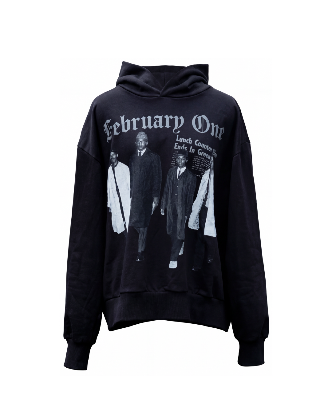 The February One hoodie is handmade with a custom wash and 290 gsm of french terry cloth. Across the chest, the date of the sit-in, February One, in 3-d puff print. Sizing for the hoodie will be located on the neck, and feature an ID number. Making your piece truly 1:1. There is an oversized style fitment to each size, in order to fit the hoodie true to size, order size down from regular.